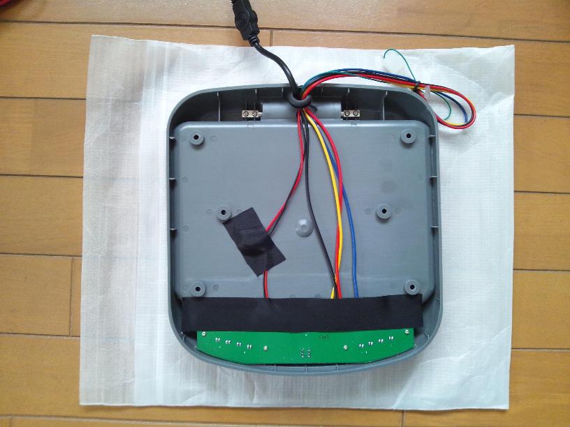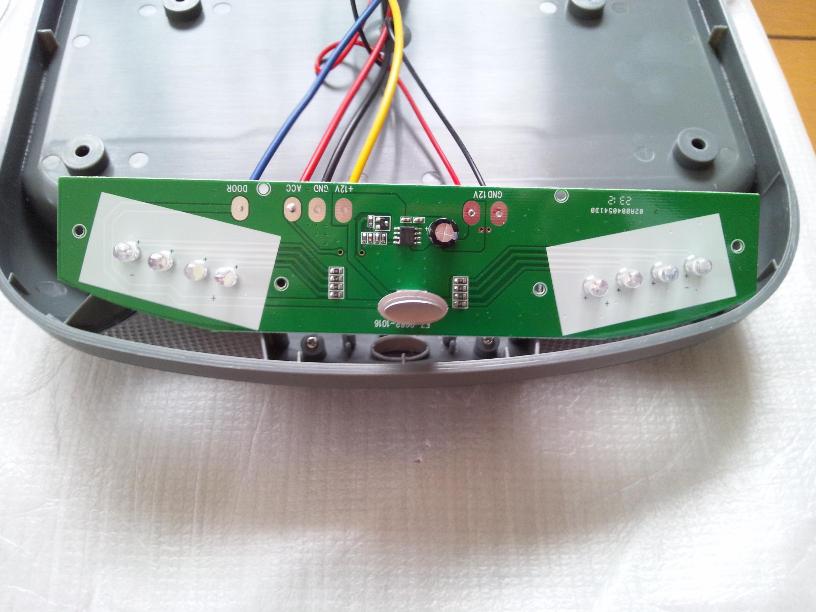 裏面の金属板を取り外してみました。写真下の方に見えるのは車内照明用LED回路の入った基板です。