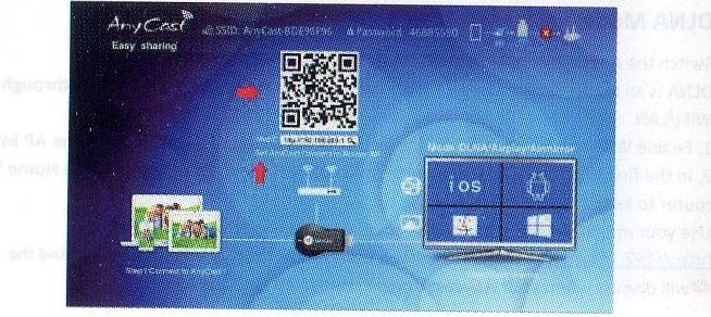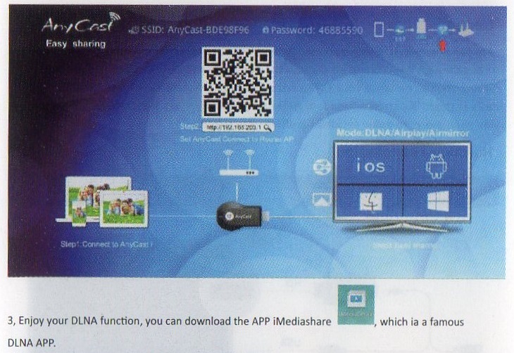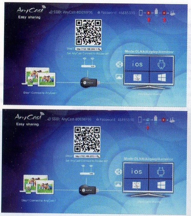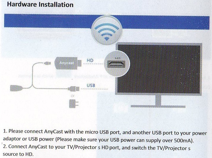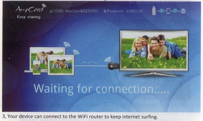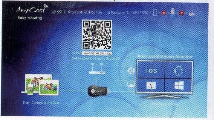 まずAnyCastのmicro USB端子にWifiモジュールを接続し、その後AnyCastをテレビにHDMI接続します。そしてUSBから5V電源を供給すると、下の写真のような画面がテレビに映し出されます。