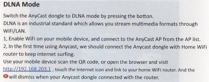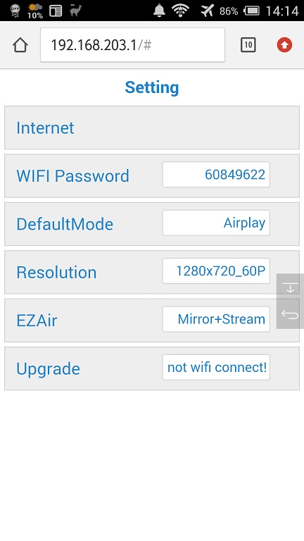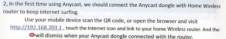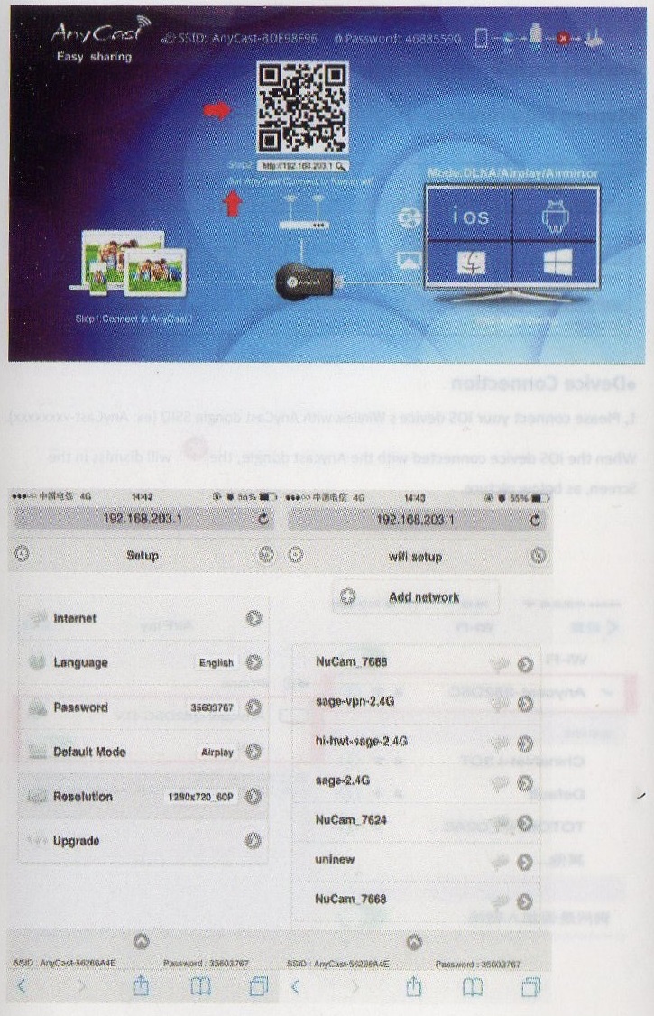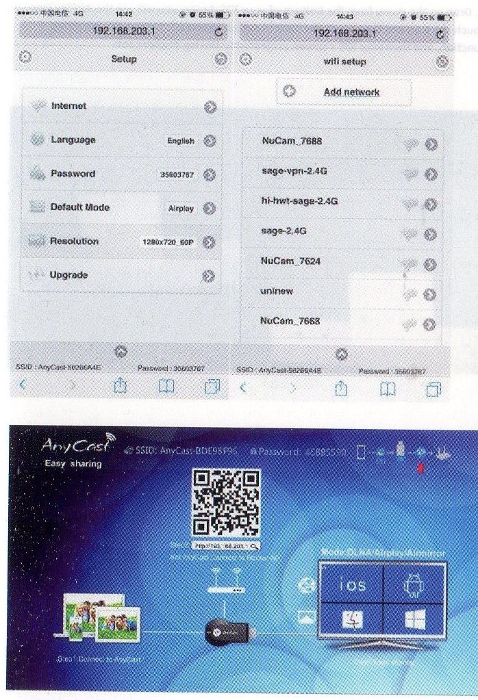 AirPlay ModeでSSIDを探し、PSKコードを入力してAnyCastに接続してからhttp://192.168.203.1にアクセスする必要があります。