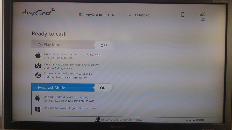 画面上部にSSIDが表示されていますので、スマホのWifi設定画面でこのSSID(上の写真ではAnyCast-BFEE2F6A)を選択します。するとパスワードを聞かれますので、テレビ画面のSSID隣に書いてあるPINコードを入力すると、AnyCastはスマホにワイヤレスディスプレイとして認識されます。