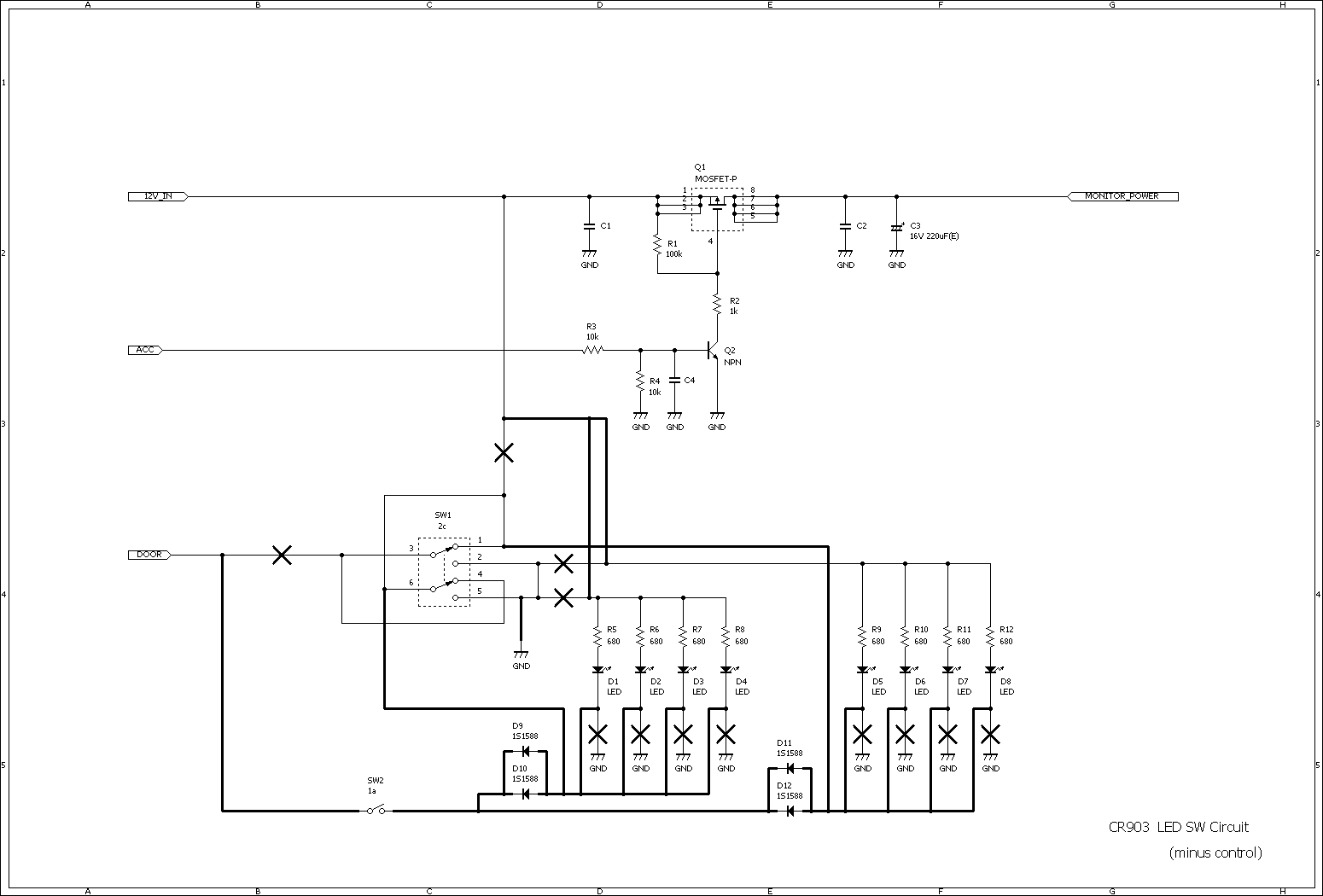 プラスコントロールとマイナスコントロールをリレーで極性反転させる方法もあるみたいですね。ただその方法だと、ドアを閉めた後の残光が再現できなくなったり、そもそも私的にはそっちの方が(リレーの置き場所を考えたりするのが)面倒だったので、基板自体を改造しちゃいました。